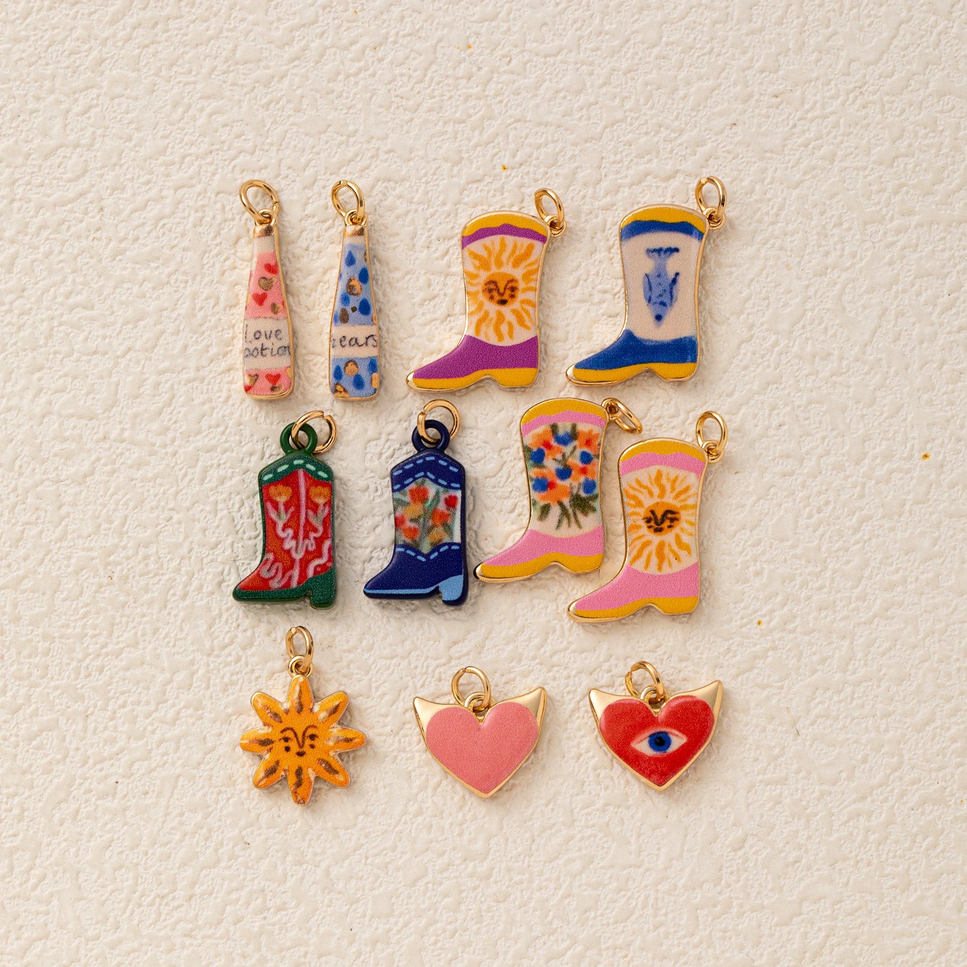 Each boot features its own unique design, from bold sunbursts to soft florals and colourful patterns, capturing that carefree, summer feeling. Set in a glossy enamel finish with gold-tone detailing, these pendants are designed to stand out while still feeling effortlessly wearable.